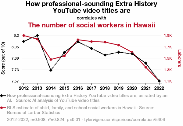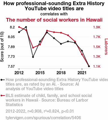 This means 82.4% of the change in the one variable (i.e., The number of social workers in Hawaii) is predictable based on the change in the other (i.e., How professional-sounding Extra History YouTube video titles are) over the 11 years from 2012 through 2022.