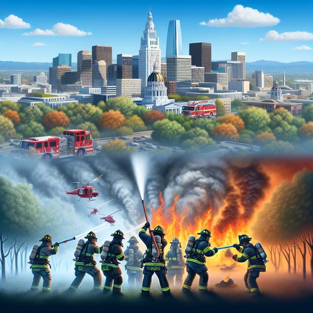 Prompt: Generate an image of the San Jose skyline, featuring clear blue skies, and the local fire department in action. Show firefighters combatting arson cases, with a sense of determination and unity, against the backdrop of cleaner air. The emphasis should be on the improved air quality and the firefighters' unwavering commitment. The scene could also include symbolic imagery to represent the battle against arson, such as a fire hose aiming towards the sky. The depiction should include only scenes, people, and objects, it should not include text or speech bubbles.