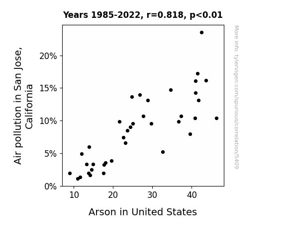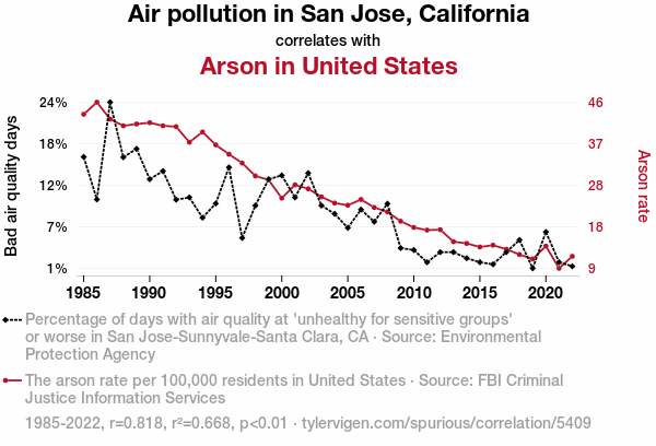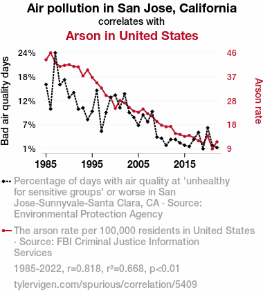 - The spurious research paper: Hot Air and Fiery Crimes: Exploring the Relationship between Air Pollution in San Jose, California and Arson in the United States