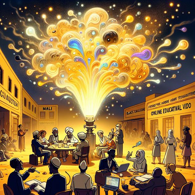 User prompt: Please describe a visual scene that prominently depicts both How fun Computerphile YouTube video titles are and Kerosene used in Mali, in the following situation: As the kerosene usage in Mali rises, it leads to an unexpected surplus of laughter-infused molecules in the atmosphere, which coincidentally boosts the creativity of Computerphile video title creators. It's like the internet is getting a dose of combustible comedy!. Keep the description simple.