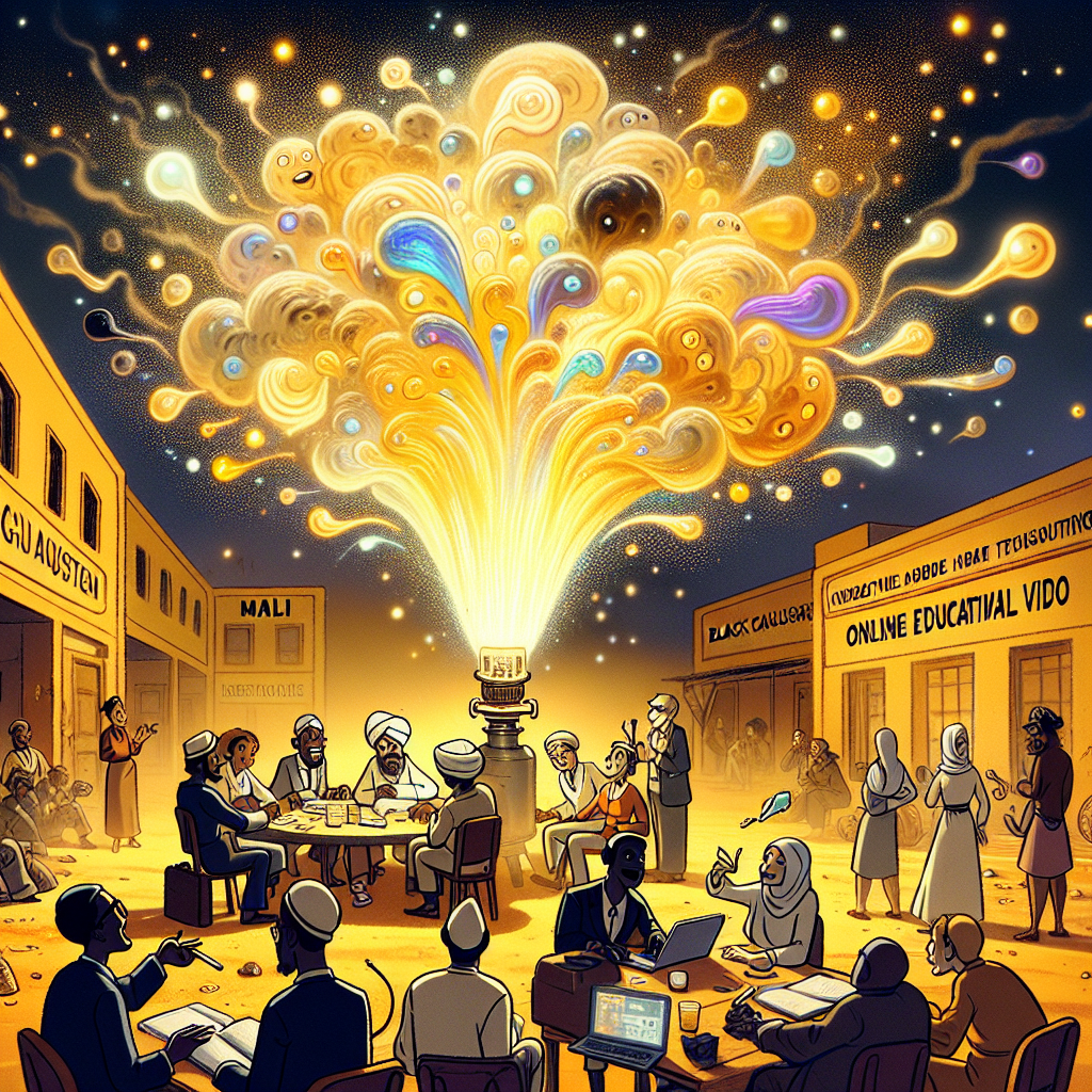 Prompt: An image that looks like it is a scene from a Pixar movie where in Mali, people are using kerosene more frequently, leading to a rise in laughter-infused molecules in the atmosphere. Meanwhile, at a Computerphile video title creation studio, the team is surrounded by swirling, colorful laughter-infused molecules, sparking a burst of creativity. The room is filled with laughter as the team comes up with hilariously fun YouTube video titles. The room is bathed in warm, golden light, with the team animatedly interacting with one another in the midst of the colorful, shimmering molecules. The depiction should include only scenes, people, and objects, it should not include text or speech bubbles.