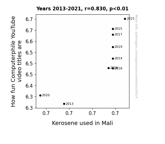 The analysis of data collected from 2013 to 2021 revealed a remarkably strong correlation between the whimsicality of Computerphile video titles and kerosene consumption in Mali (r = 0.8296455, r-squared = 0.6883117, p < 0.01). It appears that the puns and witty wordplay in the video titles were not the only things lighting up the screen – they were also igniting a spark in the energy choices of households in Mali.