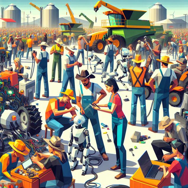 ChatGPT: Generate an image of a low poly Texas farm community with a bustling atmosphere. Show a group of farm equipment mechanics working on robots amidst the lively activity. In the background, include Simone Giertz crafting YouTube video titles, infusing them with trendiness. Capture the scene with a vibrant, dynamic energy, with the air filled with the hum of machinery and the excitement of viral video synergy.