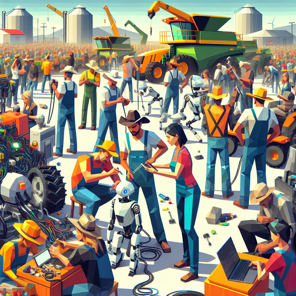 Prompt: Generate an image of a low poly Texas farm community with a bustling atmosphere. Show a group of farm equipment mechanics working on robots amidst the lively activity. In the background, include Simone Giertz crafting YouTube video titles, infusing them with trendiness. Capture the scene with a vibrant, dynamic energy, with the air filled with the hum of machinery and the excitement of viral video synergy. The depiction should include only scenes, people, and objects, it should not include text or speech bubbles.