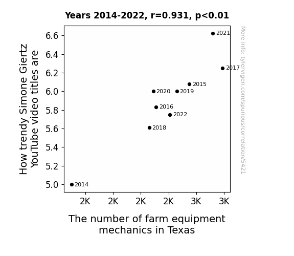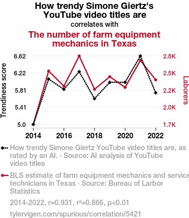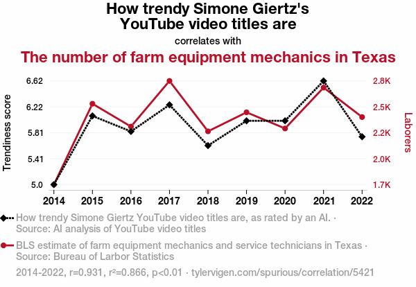 User prompt: Please provide potential search keywords for a paper titled The Mechanic Meme: Exploring the Correlation Between Simone Giertz's Trendy YouTube Video Titles and the Employment of Farm Equipment Mechanics in Texas with an abstract of In this study, we embarked on the task of unraveling the unlikely relationship between Simone Giertz's YouTube video titles and the employment of farm equipment mechanics in the vast state of Texas. Leveraging advanced AI analysis of Giertz's video titles alongside data from the Bureau of Labor Statistics, we sought to shed light on this peculiar connection. Much to our delight, a high correlation coefficient of 0.9307968 and a statistically significant p-value of less than 0.01 for the period spanning 2014 to 2022 emerged from our rigorous analysis.