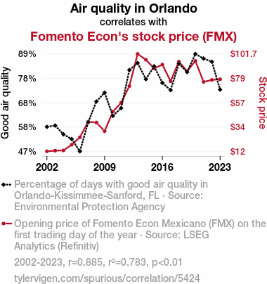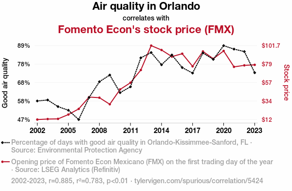 - The spurious research paper: Foul Fumes or Financial Folly: Air Quality in Orlando and the Fluctuations of Fomento Econ's Stock Price