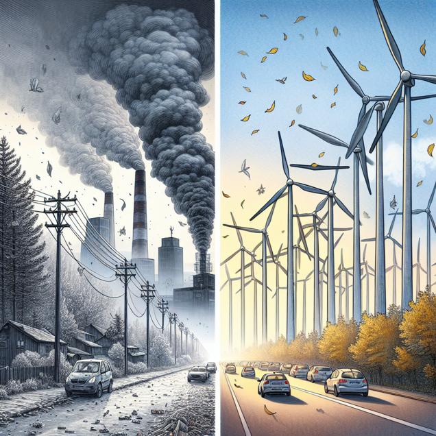 User prompt: Please respond with an image generation prompt that would be likely to create an interesting visual using DALLE-3, using the following style: [ A TIME magazine cover image ] and depicting this scene: In Coeur d'Alene, Idaho, the air was thick with pollution, creating a hazy and smoggy atmosphere. As the pollution intensified, the wind began to pick up, causing trees to sway and leaves to scatter. Meanwhile, in Luxembourg, wind turbines spun faster and more vigorously, harnessing the increased wind power to generate clean energy. Keep the visual depiction simple. Do not include any words or speech bubbles.