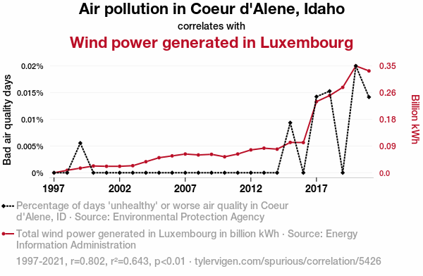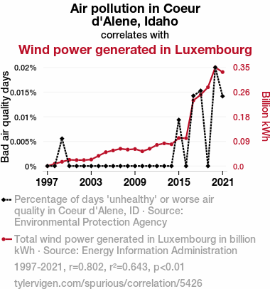 - The spurious research paper: Gale-Force Gags: Unraveling the Windy Relationship Between Air Pollution in Coeur d'Alene, Idaho and Wind Power Generation in Luxembourg