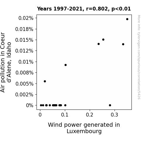 Using meticulous statistical analysis, including a correlation coefficient of 0.8016059 and p < 0.01 for the years 1997 to 2021, we uncovered a surprisingly strong, albeit whimsical, connection. It seems that as air pollution levels in Coeur d'Alene soar, so does the wind power generated in the whimsical land of Luxembourg. It's as if the winds of change are blowing a message across the globe.