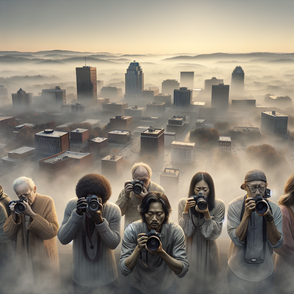 Prompt: [ A photo-realistic image ] of a group of photographers standing amidst Knoxville, Tennessee's hazy skyline. The cityscape is engulfed in a thick layer of smog, creating a sense of mystery and intrigue. The photographers are seen adjusting their cameras, capturing the mesmerizing yet elusive atmosphere. As the air starts to clear, their disappointed expressions are highlighted, capturing the challenge of capturing the unique and transient beauty in their photographs. The smog starts to lift in the background, hinting at the transition as the photographers make the decision to move on in search of new visual opportunities. The depiction should include only scenes, people, and objects, it should not include text or speech bubbles.