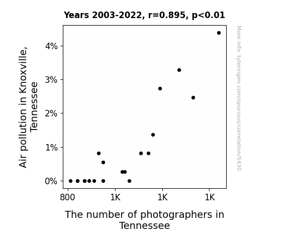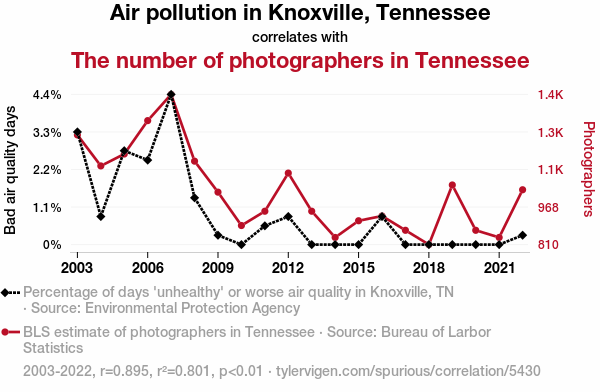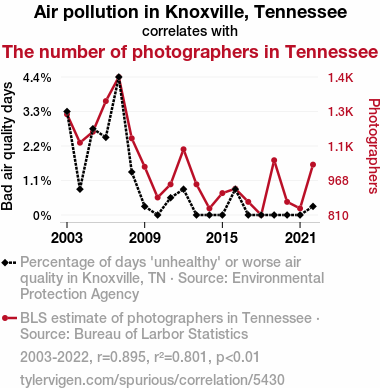 This means 80.1% of the change in the one variable (i.e., The number of photographers in Tennessee) is predictable based on the change in the other (i.e., Air pollution in Knoxville, Tennessee) over the 20 years from 2003 through 2022.