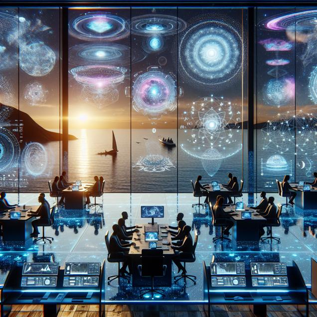 Prompt: Create an image featuring a futuristic office space on a Hawaiian beach, where compensation and benefits managers are engrossed in discussions about quantum theories. The managers are surrounded by holographic displays showcasing intricate equations and scientific graphs, while sleek, high-tech computer consoles adorn the area. In the background, a cosmic-themed backdrop sets the stage for an epic office face-off, with the PBS Space Time team fervently brainstorming amidst floating astrophysics-themed video titles and adorned with futuristic gadgets. The scene depicts a melding of high-tech office settings with cosmic elements, capturing the intergalactic battle of brainy creativity. The depiction should include only scenes, people, and objects, it should not include text or speech bubbles.