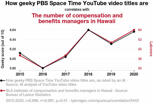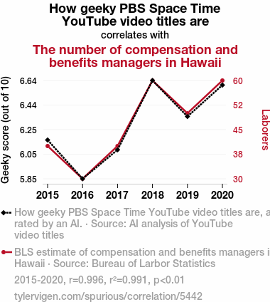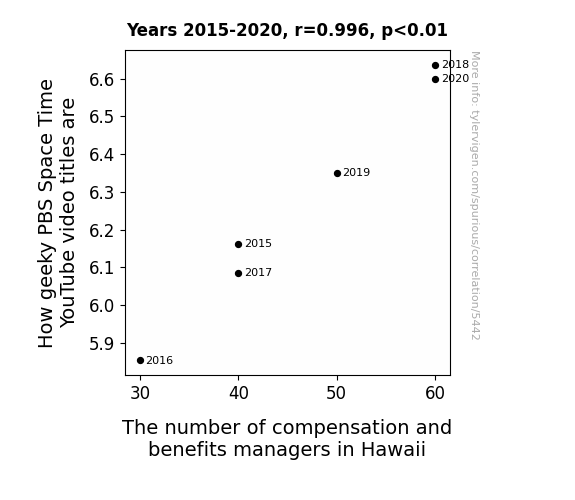 This means 99.1% of the change in the one variable (i.e., The number of compensation and benefits managers in Hawaii) is predictable based on the change in the other (i.e., How geeky PBS Space Time YouTube video titles are) over the 6 years from 2015 through 2020.