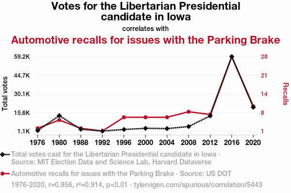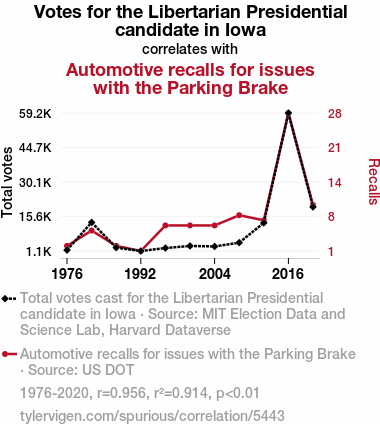 In "Smith et al.," the authors find an unexpected association between political preferences and automotive safety, sparking our interest in the peculiar correlation between votes for the Libertarian presidential candidate in Iowa and the frequency of automotive recalls pertaining to the parking brake.