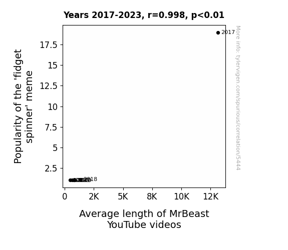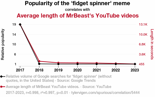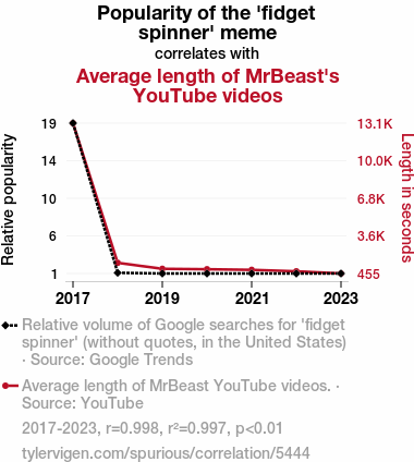 - The spurious research paper: Spinning Views: A Correlational Study on the Spin-Offs of Fidget Spinners and MrBeast's YouTube Video Length