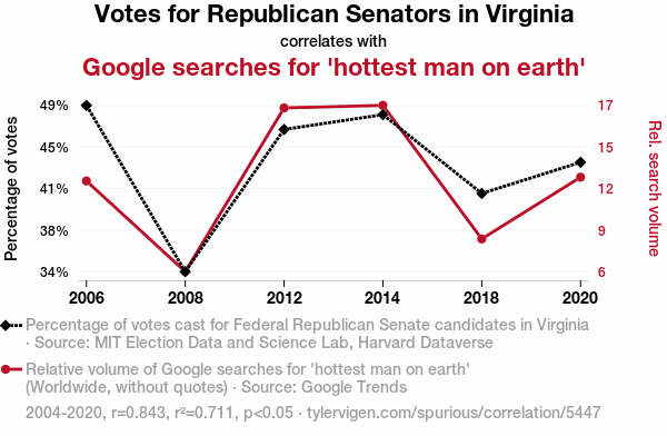- The spurious research paper: Red States and Red Hot Searches: A Correlational Analysis of Republican Senator Votes in Virginia and Google Searches for 'Hottest Man on Earth'