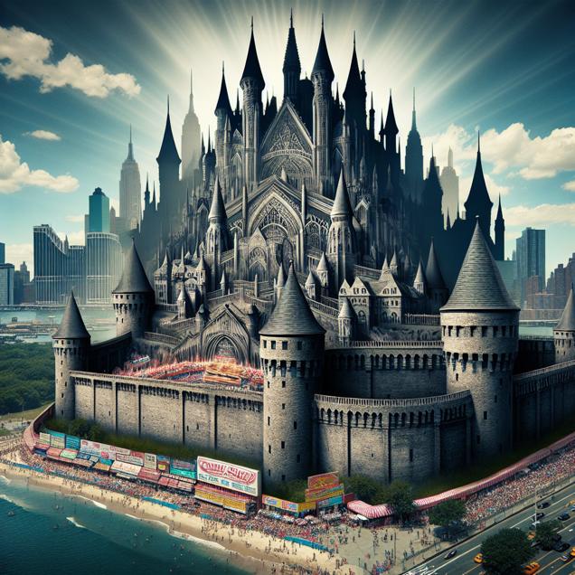 Prompt: Using the style "A scene from Skyrim," I would like DALL-E 3 to generate an image of a towering, sharp-edged fortress standing amid the New York City skyline. The fortress could resemble the structures from Skyrim, with ancient stone walls and imposing turrets. The bustling Coney Island is depicted at the forefront, with the electricity of the competition echoing the vibrancy of the hot dog eating contest. The skyline should evoke a sense of grandeur and fantasy, creating a captivating juxtaposition between the modern cityscape and the regal, enchanting fortress, all under a clear and radiant sky. The depiction should include only scenes, people, and objects, it should not include text or speech bubbles.