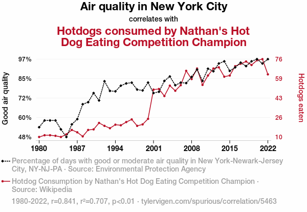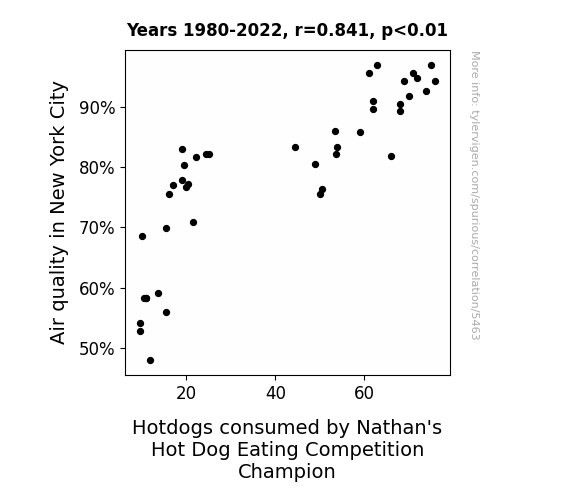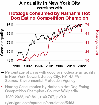 - The spurious research paper: The Great Wiener Connection: Investigating the Correlation between Air Quality in New York City and Hot Dog Consumption by Nathan's Hot Dog Eating Competition Champion