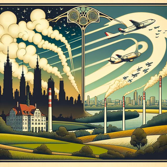 User prompt: Please respond with an image generation prompt that would be likely to create an interesting visual using DALLE-3, using the following style: [ Art nouveau ] and depicting this scene: In Warsaw, Indiana, the air is seen thick with pollution, prompting the production of air purifiers. Meanwhile, in Former Czechoslovakia, jet planes soar through clearer skies powered by energy-efficient fuel, resulting in reduced jet fuel consumption. The air purifiers from Warsaw make their way over, joining the shift toward greener aviation fuel. A tangible link from one corner of the world to another, connecting air quality and aviation choices. Keep the visual depiction simple. Do not include any words or speech bubbles.