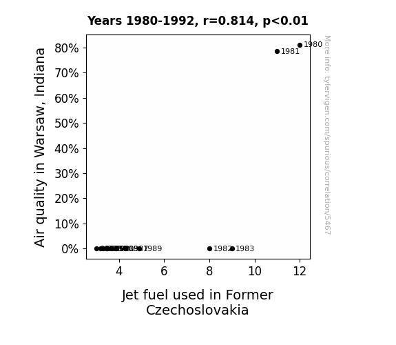 This means 66.3% of the change in the one variable (i.e., Jet fuel used in Former Czechoslovakia) is predictable based on the change in the other (i.e., Air quality in Warsaw, Indiana) over the 13 years from 1980 through 1992.
