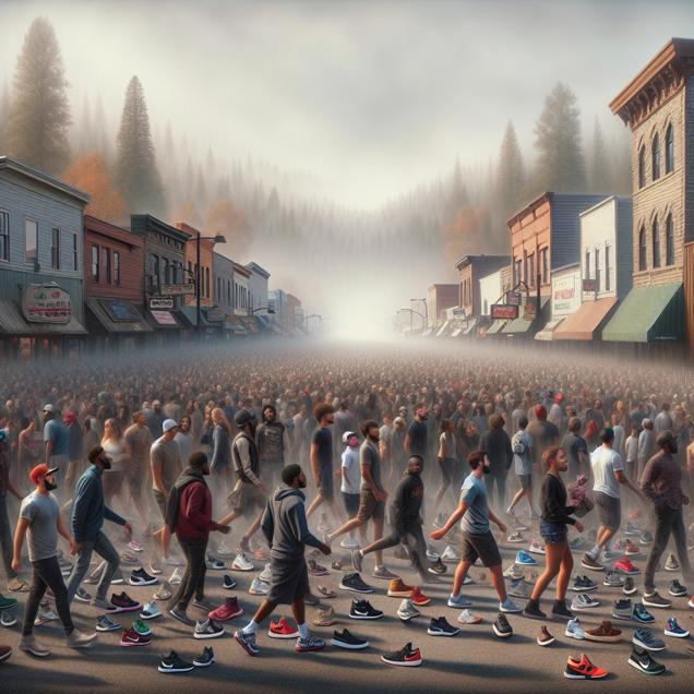 Prompt: Generate a photorealistic image of a bustling street in Sandpoint, Idaho, filled with people wearing Adidas sneakers. The hazy, polluted air should loom in the background, creating a somber atmosphere. The scene should convey the sudden surge in demand for Adidas shoes by showcasing a diverse range of individuals flocking to stores and proudly wearing their new footwear. The focus should be on capturing the unexpected trend and the impact it had on the local community, evoking a sense of intrigue and surprise in the viewer. The depiction should include only scenes, people, and objects, it should not include text or speech bubbles.