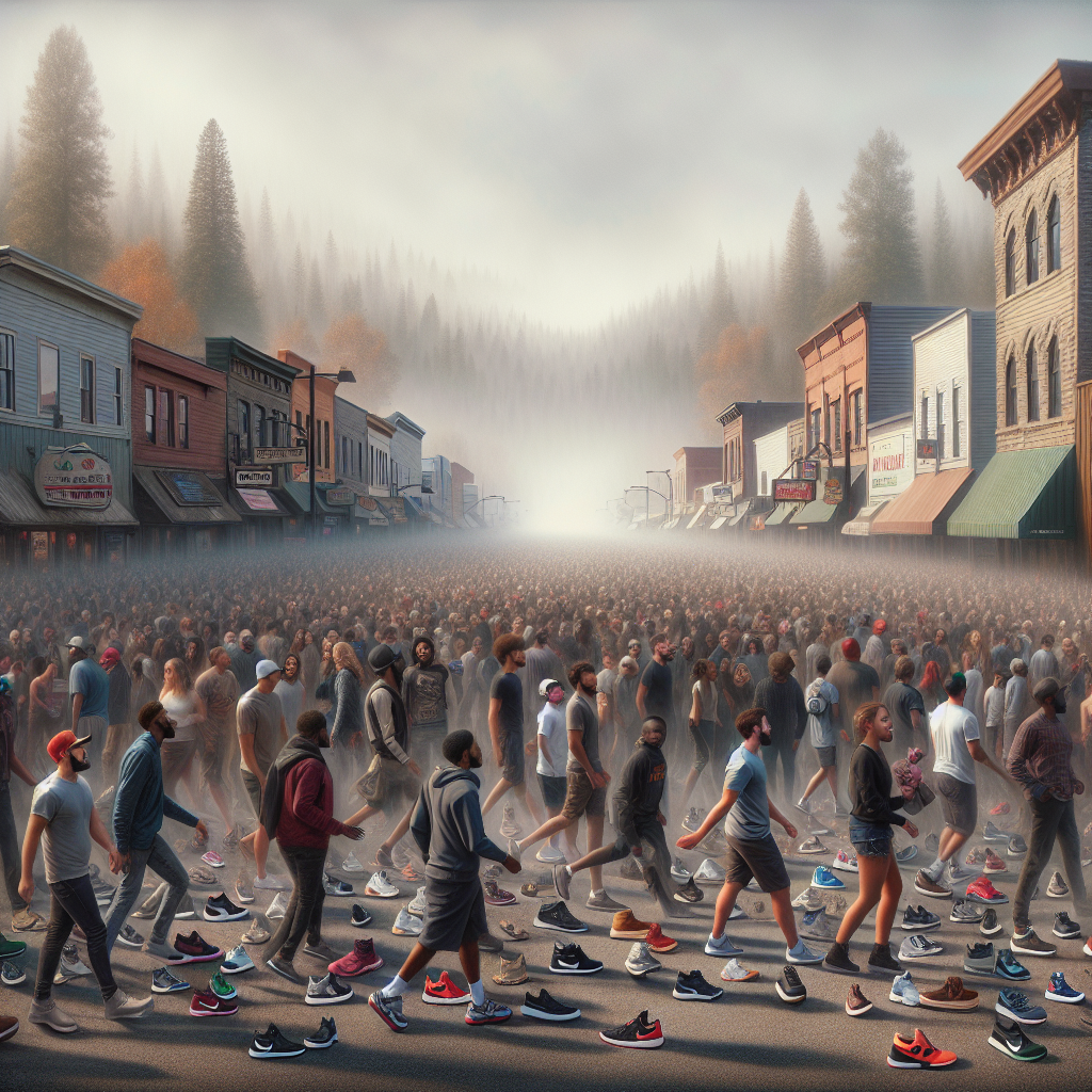 ChatGPT: Generate a photorealistic image of a bustling street in Sandpoint, Idaho, filled with people wearing Adidas sneakers. The hazy, polluted air should loom in the background, creating a somber atmosphere. The scene should convey the sudden surge in demand for Adidas shoes by showcasing a diverse range of individuals flocking to stores and proudly wearing their new footwear. The focus should be on capturing the unexpected trend and the impact it had on the local community, evoking a sense of intrigue and surprise in the viewer.