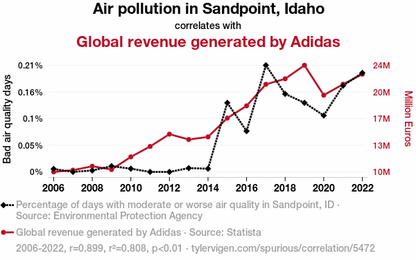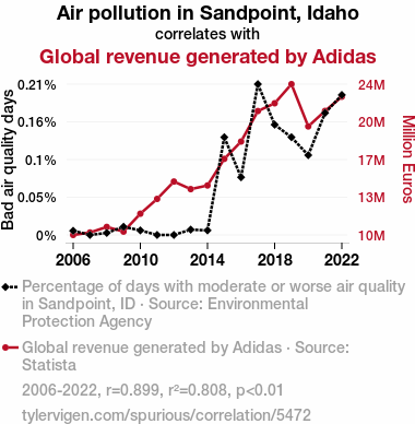 A linear line chart with years as the X-axis and two variables on the Y-axis. The first variable is Air pollution in Sandpoint, Idaho and the second variable is Global revenue generated by Adidas.  The chart goes from 2006 to 2022, and the two variables track closely in value over that time. Small Image