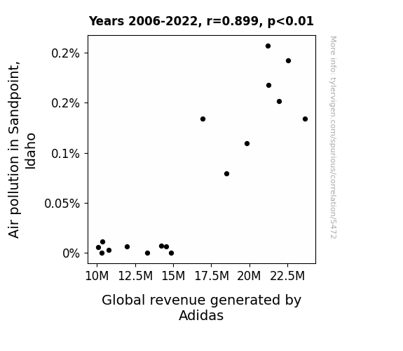The analysis of the data from 2006 to 2022 revealed a striking correlation coefficient of 0.8990226 between air pollution levels in Sandpoint, Idaho, and the global revenue generated by Adidas, with an r-squared value of 0.8082416. We can confidently assert that the association between these two variables is as clear as the stripes on a pair of Adidas sneakers. It's a match made in statistical heaven!