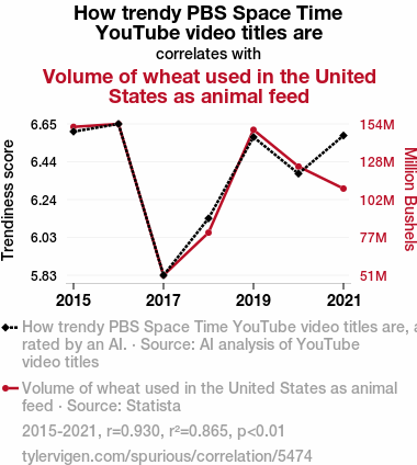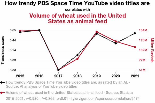 User prompt: Please make up a funny explanation for how increases in How trendy PBS Space Time YouTube video titles are positively influenced Volume of wheat used in the United States as animal feed.