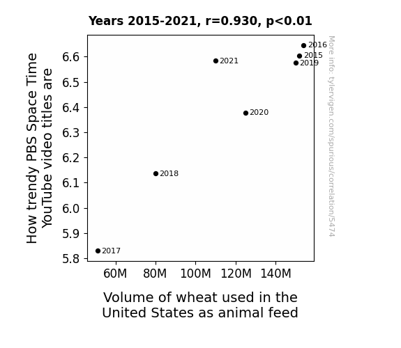 The results of our investigation unveiled a striking correlation between the trendiness of PBS Space Time YouTube video titles and the volume of wheat used as animal feed in the United States from 2015 to 2021. The correlation coefficient of 0.9299504 suggests a strong positive relationship between the two variables, indicating that as the video titles became trendier, the volume of wheat used for animal feed also experienced a synchronized increase. The r-squared value of 0.8648078 further emphasizes the robustness of this correlation, providing compelling evidence for the influence of PBS Space Time's captivating titles on the agricultural consumption landscape.