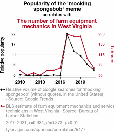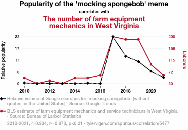 "mocking spongebob" meme, mechanic manpower, West Virginia, farm equipment mechanics, Google Trends, Bureau of Labor Statistics, rural landscape, correlation coefficient, statistical significance, occupational preferences, internet humor, labor market dynamics
