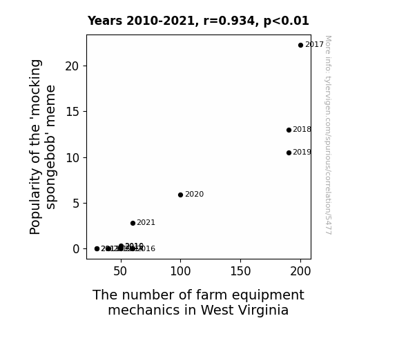The analysis of the data spanning from 2010 to 2021 reveals a noteworthy correlation between the popularity of the "mocking spongebob" meme and the number of farm equipment mechanics in West Virginia. The correlation coefficient of 0.9342084 indicates a strong positive relationship between these seemingly disparate variables. This finding implies that as the prevalence of the "mocking spongebob" meme surged in the online realm, the workforce of farm equipment mechanics in the rural expanse of West Virginia exhibited a corresponding increase.