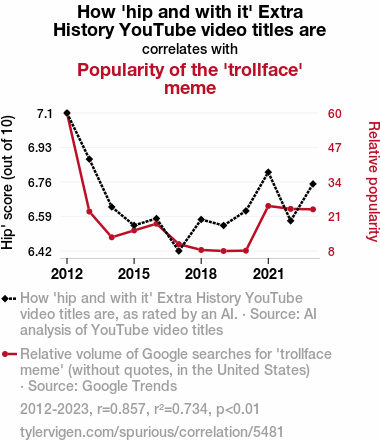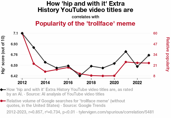 This means 73.4% of the change in the one variable (i.e., Popularity of the 'trollface' meme) is predictable based on the change in the other (i.e., How 'hip and with it' Extra History YouTube video titles are) over the 12 years from 2012 through 2023.