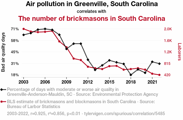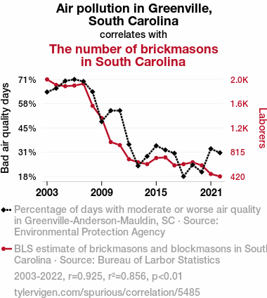 - The spurious research paper: Brick by Brick: The Relationship Between Air Pollution in Greenville, South Carolina, and the Number of Brickmasons in the State