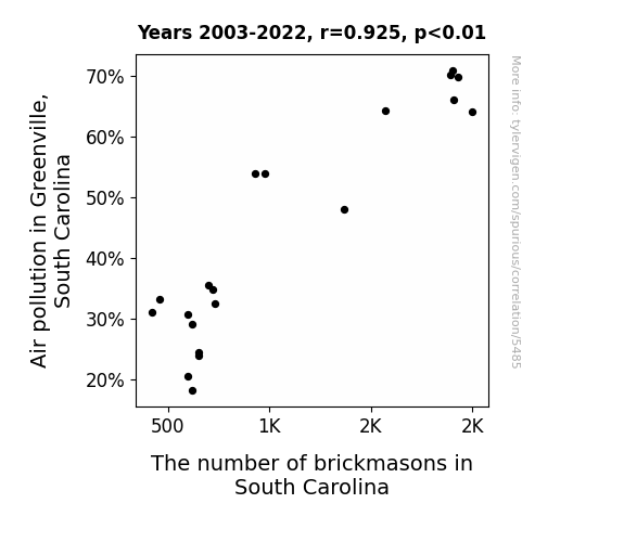 The data analysis conducted for this study revealed a striking correlation between air pollution in Greenville, South Carolina, and the number of brickmasons employed in the state of South Carolina from 2003 to 2022. The correlation coefficient of 0.9251263 and an r-squared value of 0.8558586 indicated a strong and statistically significant relationship between these two seemingly unrelated variables. The p-value of less than 0.01 further underscored the robustness of this association. Despite the curious nature of this connection at first glance, the results unequivocally point to a compelling interplay between these two factors.