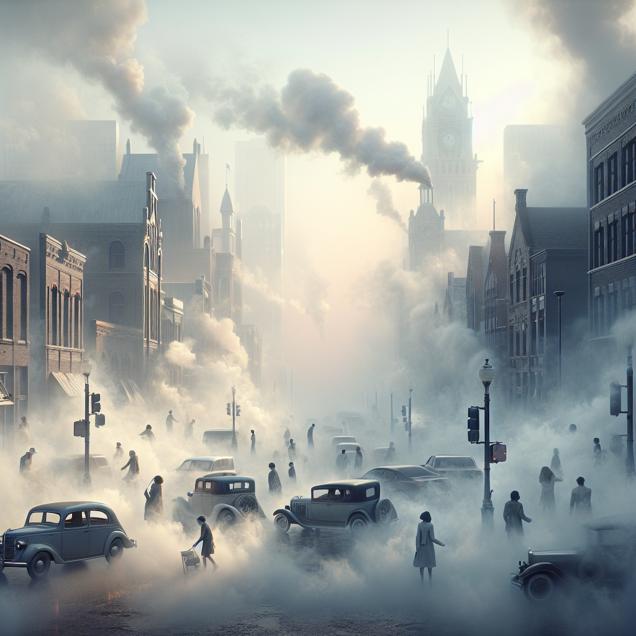 Prompt: Prompt: Generate an image of a cityscape in Holland, Michigan, shrouded in a hazy fog of air pollution. The dimmed view of buildings and cars creates an atmosphere reminiscent of the misty scenes from the Titanic movie. People walking about are obscured by the smog, some of them visibly reaching for their phones to search for 'Titanic' on Google, initiating an online exploration of the historic ship. Enhanced Prompt: Create a realistic and immersive cityscape of Holland, Michigan, blanketed in a hazy fog of air pollution. The fog should be depicted as swirling and thick, partially obscuring the buildings and cars in the surroundings. The scene should convey a sense of mystery and nostalgia, evoking the atmospheric mood from the Titanic movie. Include a few individuals walking about, their forms partially obscured by the smog. Some of them should be depicted reaching for their phones, as if searching for 'Titanic' on Google. The composition should capture the intersection between the real-world environment and the digital exploration of history in a visually compelling manner. The depiction should include only scenes, people, and objects, it should not include text or speech bubbles.