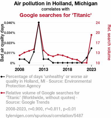 A linear line chart with years as the X-axis and two variables on the Y-axis. The first variable is Air pollution in Holland, Michigan and the second variable is Google searches for 'Titanic'.  The chart goes from 2008 to 2023, and the two variables track closely in value over that time. Small Image