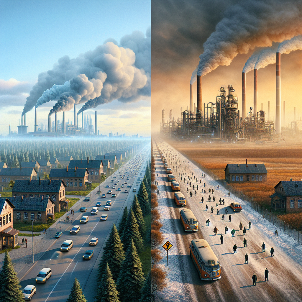 ChatGPT: Generate an image of a hyper-realistic scene depicting a hazy atmosphere in Wisconsin Rapids, with smoke and fumes emitted from factories and vehicles. Meanwhile, in Germany, East, show a kerosene production site with a slowdown in activity. The molecules from Wisconsin Rapids, known as "fumes-on-tour," should be visually represented as they arrive in Germany and settle in for a much-needed rest. The contrasting scenes should emphasize the effects of pollution and the relief of cleaner air.