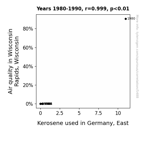 This means 99.8% of the change in the one variable (i.e., Kerosene used in Germany, East) is predictable based on the change in the other (i.e., Air quality in Wisconsin Rapids, Wisconsin) over the 11 years from 1980 through 1990.