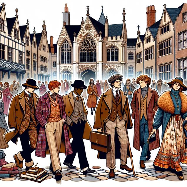 Prompt: Generate an image of a medieval college town with a mix of architectural styles. The scene is bustling with college history teachers and students dressed in trendy ensembles, mingling on the cobblestone streets. The fashionable professors exude confidence and sophistication, inspiring others to embrace stylish looks. Meanwhile, in the background, incorporate elements from MinuteEarth such as a video title or logo subtly morphing to reflect the latest fashion trends, infusing a hint of flair and faux fur finesse to the historical setting. The depiction should include only scenes, people, and objects, it should not include text or speech bubbles.