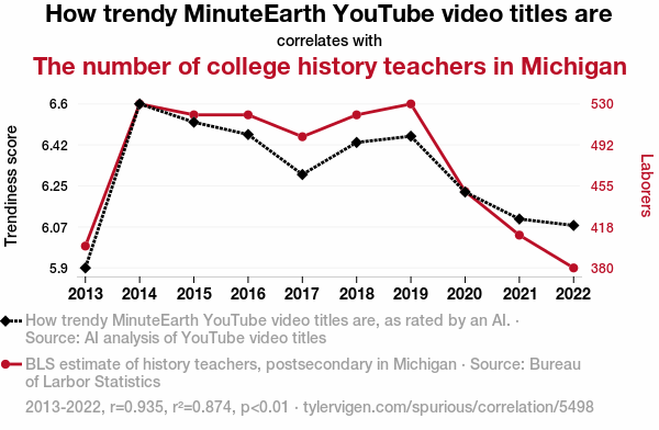 User prompt: Please make up a funny explanation for how an increase in How trendy MinuteEarth YouTube video titles are caused The number of college history teachers in Michigan to increase. Include one good pun.