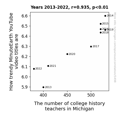 The analysis revealed a remarkably strong positive correlation between the trendy MinuteEarth YouTube video titles and the number of college history teachers in Michigan for the period from 2013 to 2022. The correlation coefficient of 0.9351229 indicates a robust relationship between these seemingly disparate entities, as if they were two peas in a pod (or two planets in a galaxy, depending on your preference).