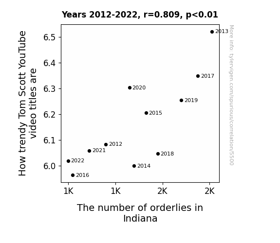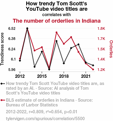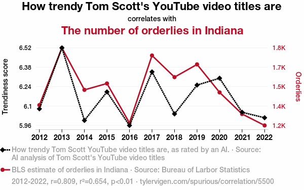 User prompt: Please make up a funny explanation for how increases in How trendy Tom Scott YouTube video titles are positively influenced The number of orderlies in Indiana.