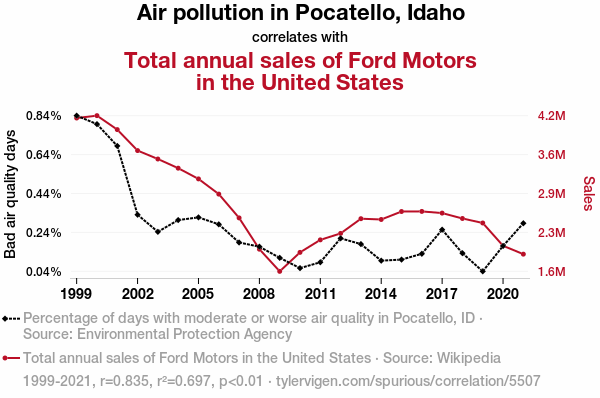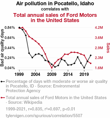 A linear line chart with years as the X-axis and two variables on the Y-axis. The first variable is Air pollution in Pocatello, Idaho and the second variable is Total annual sales of Ford Motors in the United States.  The chart goes from 1999 to 2021, and the two variables track closely in value over that time. Small Image