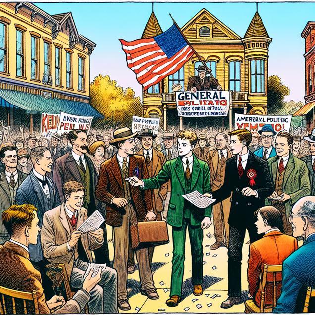 ChatGPT: In a bustling town square in Kansas, a young man named Killian is surrounded by a group of enthusiastic new friends, all of whom he has just met. As they gather around him, he hands each of them a small slip of paper, representing their "vote" in his personal libertarian utopia. Meanwhile, in the background, the Libertarian Presidential candidate's campaign banner waves proudly in the wind, drawing curious glances from passersby.