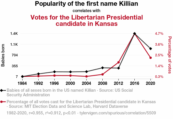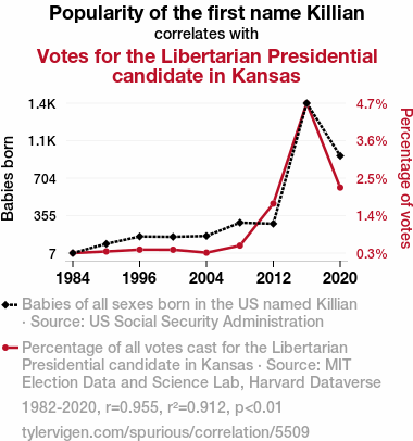 User prompt: Please provide potential search keywords for a paper titled Killian It at the Ballot Box: An Examination of the Name's Influence on Libertarian Votes in Kansas with an abstract of This paper presents a quirky yet compelling analysis of the relationship between the popularity of the first name Killian and votes for the Libertarian presidential candidate in the state of Kansas. Drawing from data sets provided by the US Social Security Administration, as well as the MIT Election Data and Science Lab and Harvard Dataverse, our research team endeavored to unravel this peculiar connection. To our surprise, we uncovered a strong correlation coefficient of 0.9550334, with a significance level of p < 0.01, spanning the years 1982 to 2020. The implications of our findings are as fascinating as they are improbable, shedding light on the inexplicable sway of nomenclature on political preferences. In our exploration of this uncharted territory, we offer humor, statistical rigor, and a unique perspective, highlighting the sometimes whimsical nature of human behavior and decision-making.