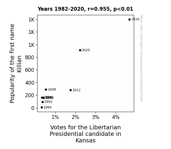 As if pulled straight from the annals of an absurdist comedy, our investigation uncovers a statistically robust relationship between the estimated number of individuals bearing the name Killian and the votes garnered by the Libertarian presidential candidate in Kansas. Our findings unveil a correlation coefficient of 0.9550334, with a significance level as compelling as a magician's sleight of hand, at p < 0.01, spanning the peculiarly specific epoch of 1982 to 2020.