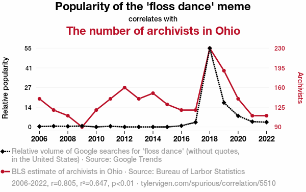 A linear line chart with years as the X-axis and two variables on the Y-axis. The first variable is Popularity of the 'floss dance' meme and the second variable is The number of archivists in Ohio.  The chart goes from 2006 to 2022, and the two variables track closely in value over that time. Small Image