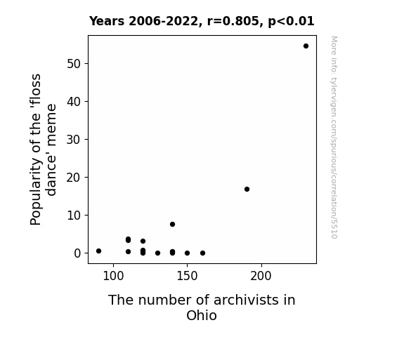 Our investigation into the correlation between the popularity of the Floss dance meme and the number of archivists in Ohio unearthed some truly unexpected and, dare I say, funky results. The correlation coefficient of 0.8045275 suggested a strong positive relationship between the two variables over the period from 2006 to 2022. This finding indicates that as the Floss dance meme garnered more attention, the number of archivists in Ohio also experienced a notable increase.