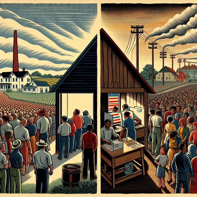 Prompt: Generate an image inspired by a woodblock painting style. In the scene, a large group of people in Iowa are fervently casting votes for the Republican Presidential candidate, creating an atmosphere charged with political energy. This excitement triggers a ripple effect, visually conveyed as a surge of energy emanating from the voting area. This energy then extends globally to Czechia, where people are shown enthusiastically choosing LPG as a popular energy choice. The image captures the unique and impactful connection between the shared fervor for politics and the surge of interest in LPG, creating a visually striking narrative that emphasizes the interplay of diverse influences. The depiction should include only scenes, people, and objects, it should not include text or speech bubbles.